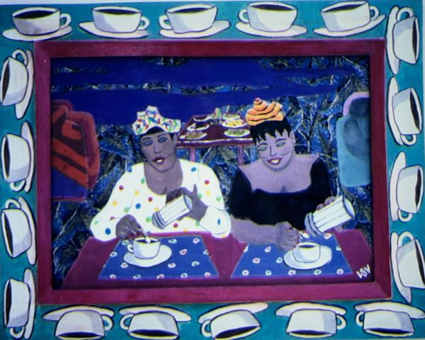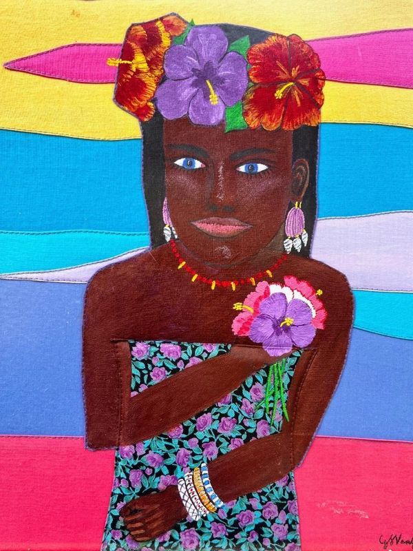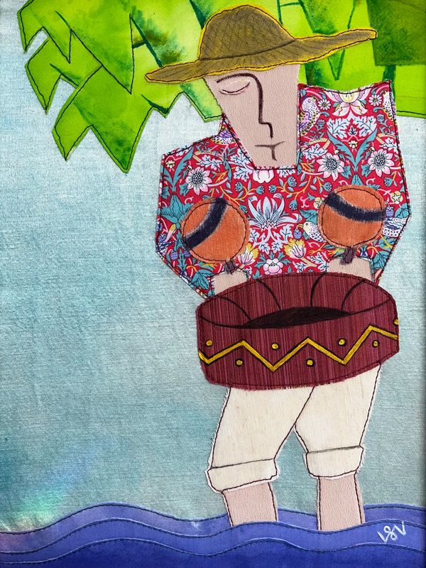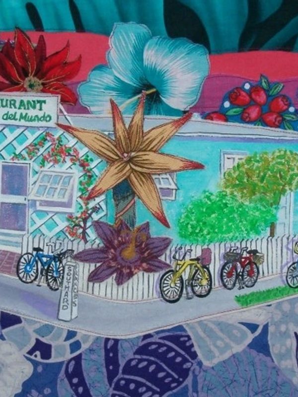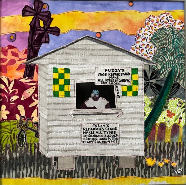 sewn & painted hemp, silk, linen, rayon and Liberty of London lawn cotton with non-toxic silk dyes & acrylic paint, from a 1990 design by Herman Vega. Frame: recycled barnwood. Image size 9 x 12”… framed: 14 x 17”