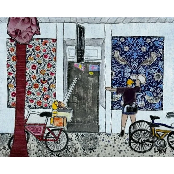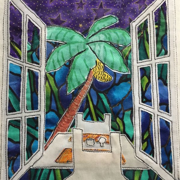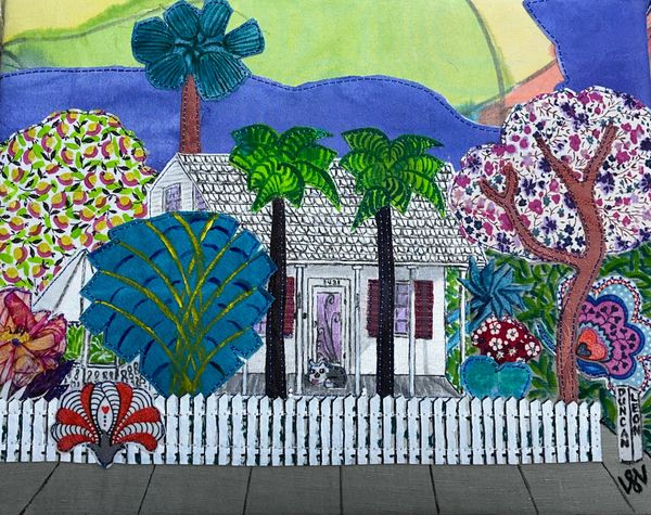 sewn & painted mixed-media cotton and upholstery fabrics with acrylic, 8 x 10"