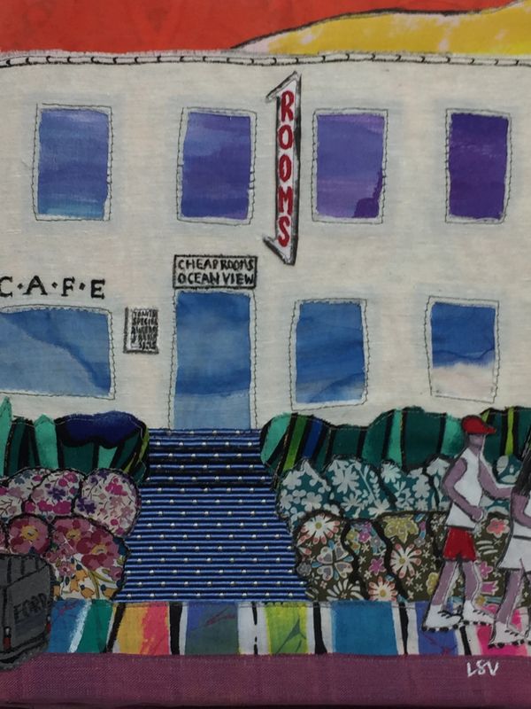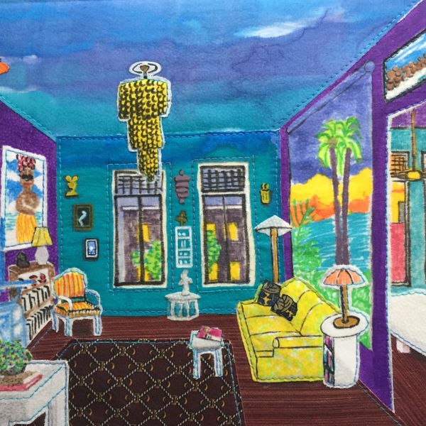 sewn and painted mixed-media: cotton and upholstery fabrics with acrylic paint, 16 x 20”