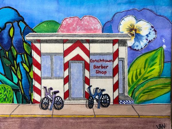 Mixed-media sewn and painted hemp, silk, linen, and Liberty of London lawn cotton, with silk dyes, acrylic paint & silk dye markers... 8x10"
