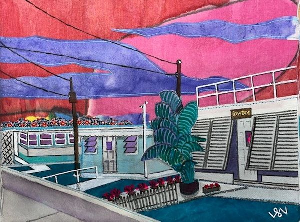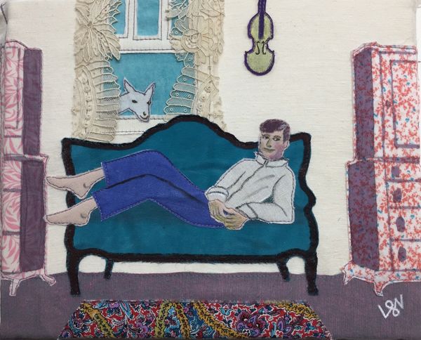 Mixed-Media sewn & painted hemp, silk, rayon, linen, and cotton upholstery fabric with silk dyes and acrylic paint, image 8 x 10” in recycled wood frame, 10 x 12”