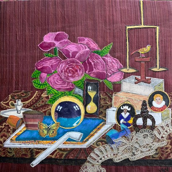 Mixed-Media sewn & painted hemp, silk, linen, cotton batik, and Liberty of London lawn cotton, with silk dyes & acrylic paints, 12 x12”